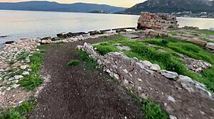stroll hand in hand at sunset toward ancient outdoor ruins with petite friend