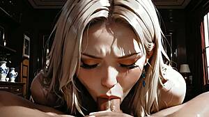 Blonde bombshell with big blue eyes slurps massive cocks hungrily in hentai scene